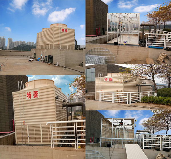 惠州東江環保橫流方形冷卻塔安裝 廣東特菱空調(http://m.sgegfpd.com)方形橫流式玻璃鋼冷卻塔結構特點: (1)擋板:玻璃鋼材質,表面光滑美觀,耐腐蝕,防老化。 (2)填料:改性聚氯