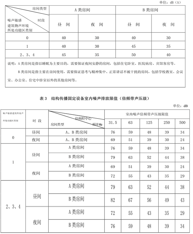 表2 結(jié)構(gòu)傳播固定設備室內(nèi)噪聲排放限值(等效聲級)